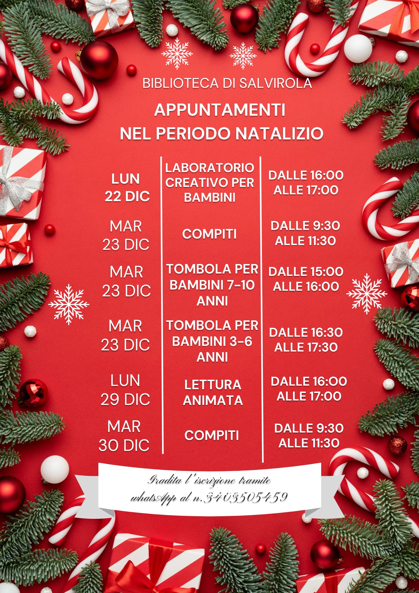 - martedì 23 dicembre: tombola per bambini dai 3 ai 6 anni, dalle ore 16.30 alle ore 17.30;