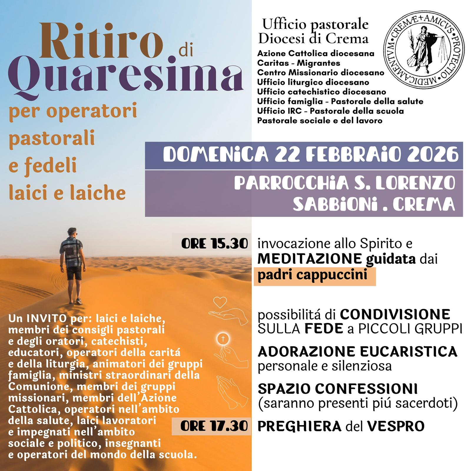 Si allega la locandina del ritiro di Quaresima, promosso dall'Ufficio pastorale della Diocesi di Crema, porgrammato per domenica 22 febbraio 2026 nella parrocchia di San Lorenzo, quartiere dei Sabbioni, a Crema, a partire dalle ore 15.30.